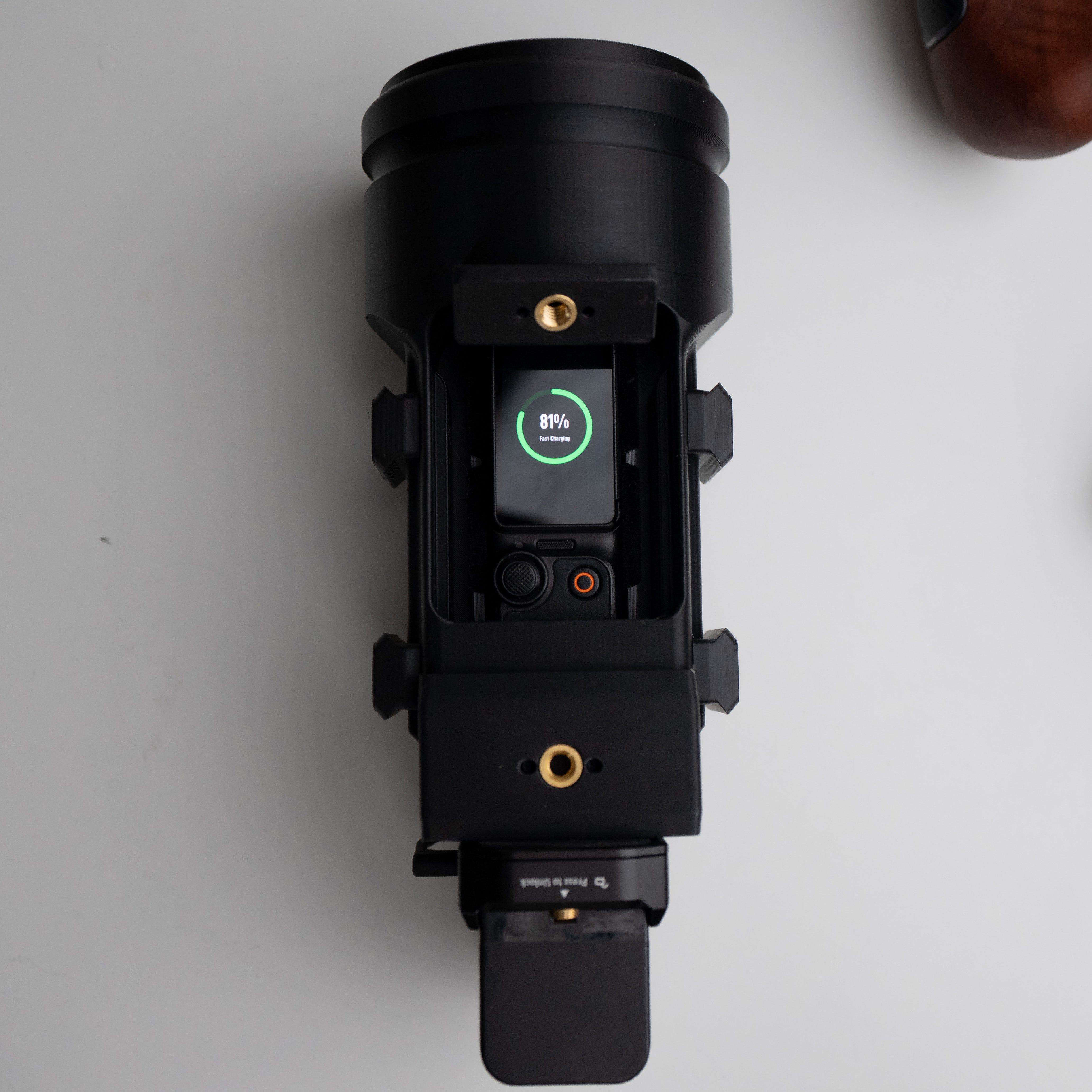 Phone + DJI Mimo recommended: This slim build blocks the physical thumb controller and record button; rotate the OP3 screen to start/stop or control via the app.